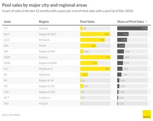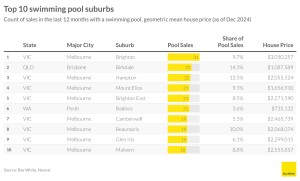 But Melbourne emerges as a fascinating outlier, ranking second in terms of total pool sales and dominating the list of top 10 suburbs despite being the second-southern most capital city in Australia.