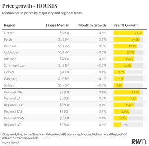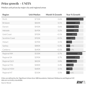 The unit market continues to show greater resilience than houses. While some cities have seen slight monthly declines, overall performance has been more stable. This reflects ongoing affordability pressures, as well as the impact of generous first home buyer incentives, which are continuing to support demand in this segment.